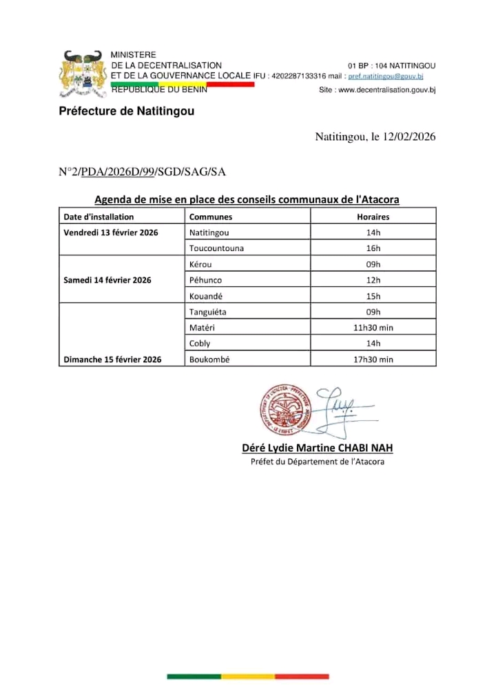 Par une note en date du jeudi 12 février 2026, la préfète de l’Atacora, Déré Lydie Martine Chabi Nah, a rendu public le calendrier de la tournée consacrée à la mise en place des conseillers communaux. L’opération s’étalera sur trois jours, à compter du vendredi 13 au dimanche 15 février 2026, et concernera l’ensemble des neuf (09) communes du département.