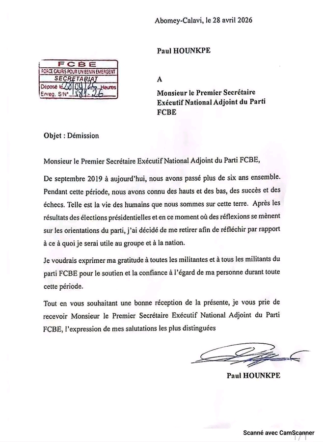 Paul Hounkpè tourne une page importante de sa carrière politique. Quelques jours après sa défaite à l’élection présidentielle du 12 avril 2026, le président de la Force Cauris pour un Bénin Émergent (FCBE) a annoncé sa démission de la tête de cette formation politique de l’opposition.