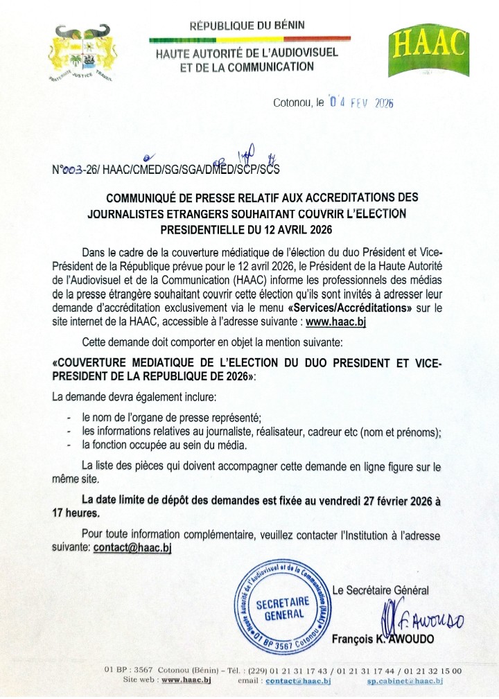 ÉLECTION PRÉSIDENTIELLE DU 12 AVRIL AU BÉNIN : La HAAC publie les conditions d’accréditation des médias étrangers