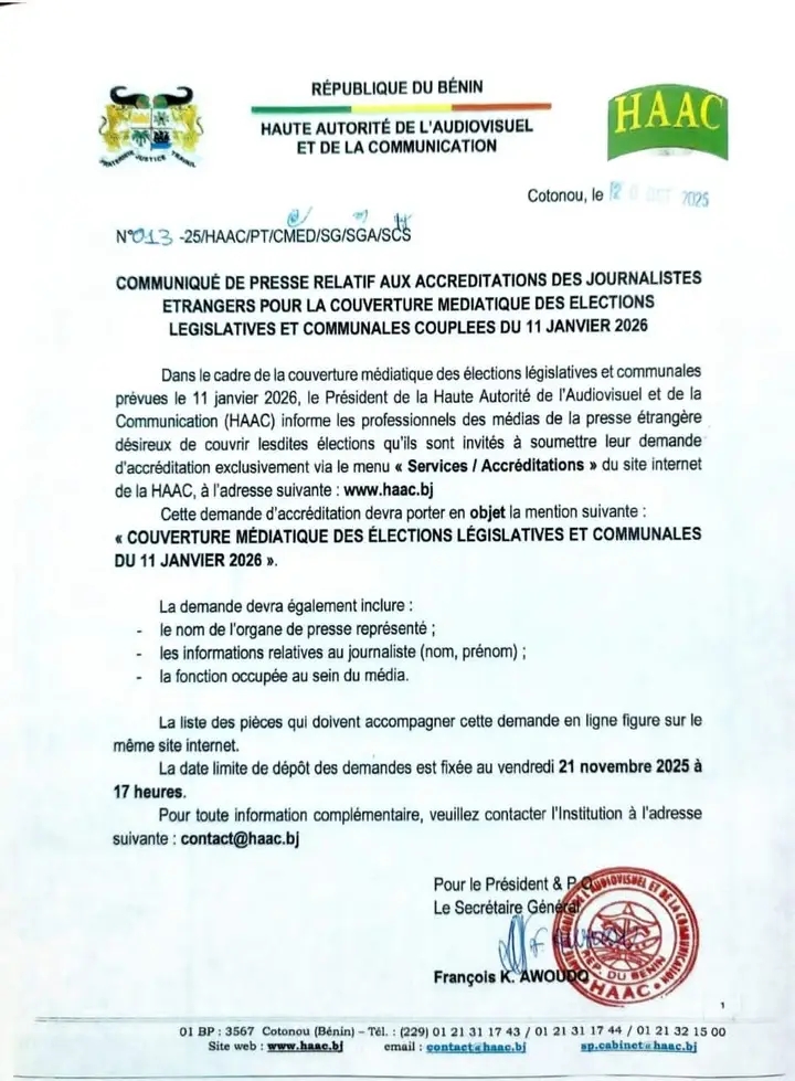 À moins de trois mois des élections législatives et communales prévues pour le 11 janvier 2026, la Haute Autorité de l’Audiovisuel et de la Communication (HAAC) met de l’ordre dans la couverture médiatique internationale. Par un communiqué officiel rendu public le 20 octobre 2025, l’institution régulatrice des médias a apporté des clarifications sur la procédure d’accréditation des journalistes étrangers désireux de couvrir le scrutin.