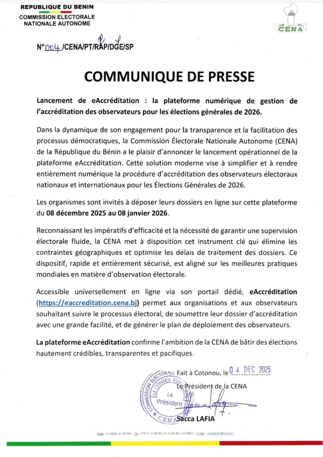 Engagée dans une démarche de transparence et de modernisation du processus démocratique, la Commission électorale nationale autonome (CENA) vient de rendre opérationnelle sa nouvelle plateforme d’accréditation destinée aux observateurs des élections générales de 2026. Ouvert du 08 décembre 2025 au 08 janvier 2026, ce portail numérique permet désormais aux organisations nationales et internationales de déposer leurs dossiers en ligne, sans aucune contrainte géographique ni délai excessif.