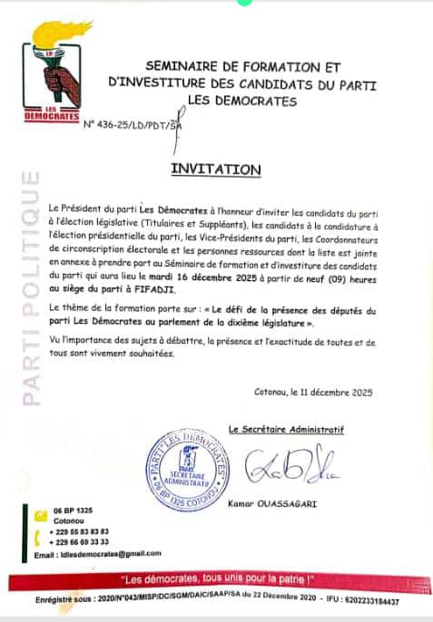 À moins d’un mois des élections législatives et communales prévues pour le 11 janvier 2026, le parti Les Démocrates entre résolument dans une phase décisive de sa préparation électorale. Ce mardi 16 décembre 2025, au siège national du parti à Fifadji, s’ouvre un séminaire stratégique de formation et d’investiture qui va réunir les candidats titulaires et suppléants aux législatives, les prétendants à la candidature présidentielle, les coordonnateurs des circonscriptions électorales ainsi que plusieurs personnes ressources du parti.