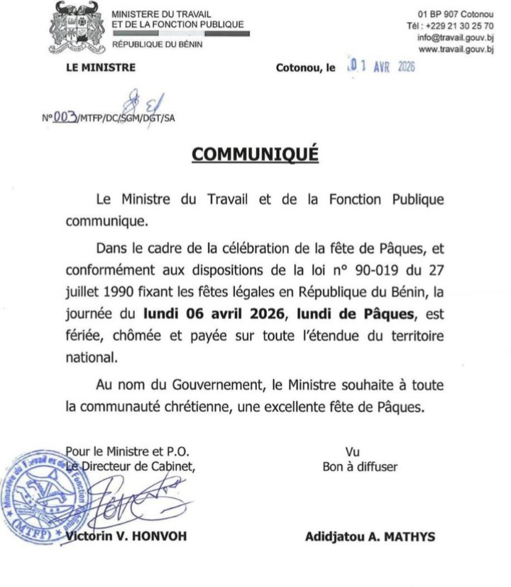 Le ministre du Travail et de la Fonction publique a rendu public un communiqué à l’occasion de la célébration de la fête de Pâques. Il informe que la journée du lundi 6 avril 2026, correspondant au lundi de Pâques, est déclarée fériée, chômée et payée sur toute l’étendue du territoire national.