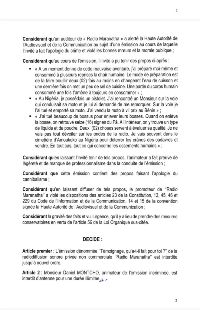 Selon la décision N°26-002/HAAC, l’animateur aurait laissé son interlocuteur faire « l’apologie du crime » et porter atteinte « aux bonnes mœurs et à la morale publique ». La transcription publiée par l’institution de régulation fait état de déclarations d’une extrême gravité. L’invité y relate un passé criminel marqué par des actes de cannibalisme, décrivant avec précision des faits supposément commis au Bénin et au Nigeria. Des propos jugés choquants, attentatoires à la dignité humaine et contraires à l’éthique des médias.