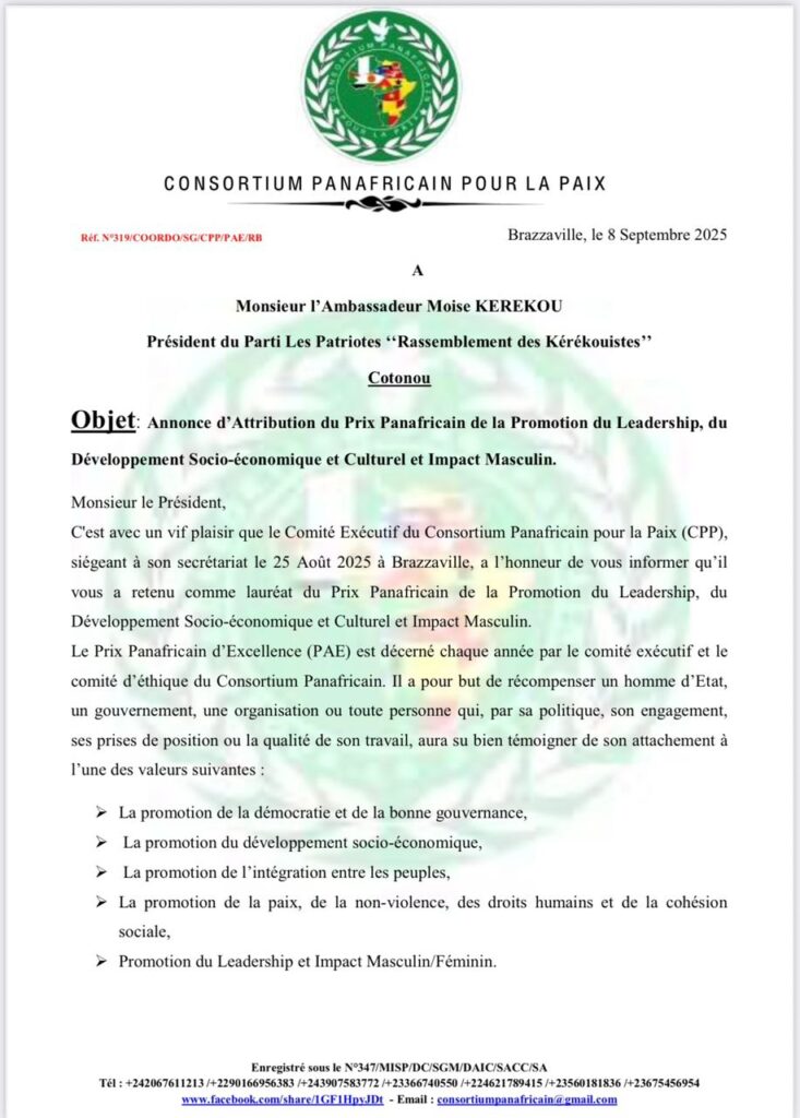 Le Consortium Panafricain pour la Paix (CPP), dont le secrétariat général est basé au Congo Brazzaville, a décidé d’honorer cette année une figure emblématique de la scène politique du Bénin. Il s’agit de Moïse Tchando Kérékou, ancien Ambassadeur plénipotentiaire du Bénin près la République de Turquie et président du parti Les Patriotes Rassemblement des Kérékouïstes (LP-RK). La notification de cette distinction a été rendue publique le lundi 6 octobre 2025.